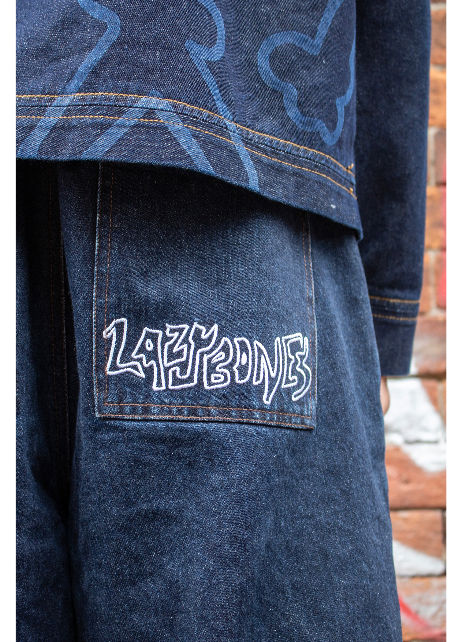 - 'Lazybones' embroidered onto back right pocket.